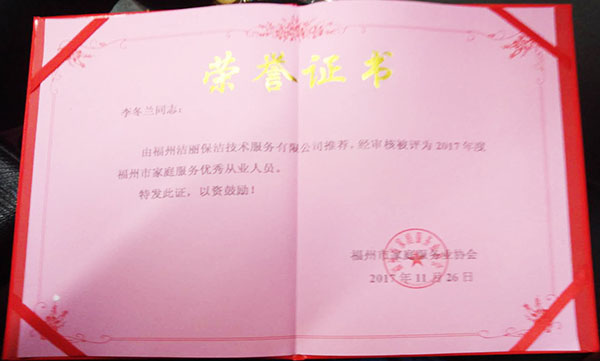 福州市商務局處長(cháng)、福州市婦聯部長(cháng)及福州市家庭服務業協會(huì)會(huì)長(cháng)共同爲20名優秀家政(含潔麗家政)從業人員頒發(fā)榮譽證書。